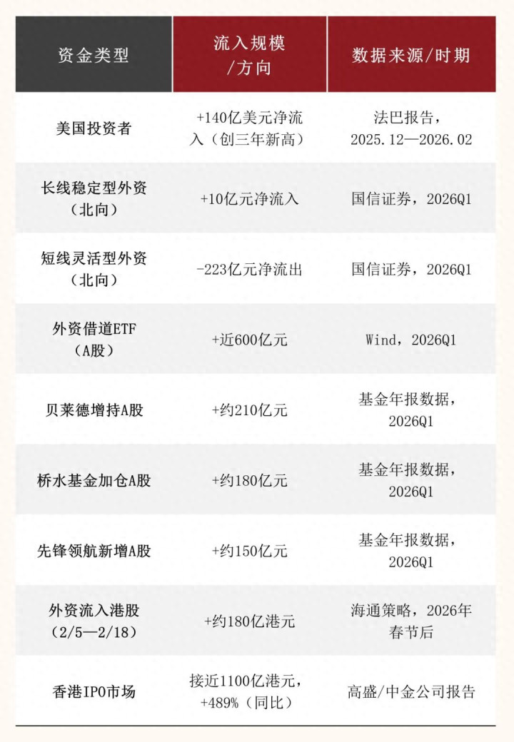 2025年12月到2026年2月,这三个月里,美国投资者向中国内地和港股投入了140亿美元,创下了三年以来连续三个月资金净流入的最高规模,说白了就是外资真真切切进场了。
