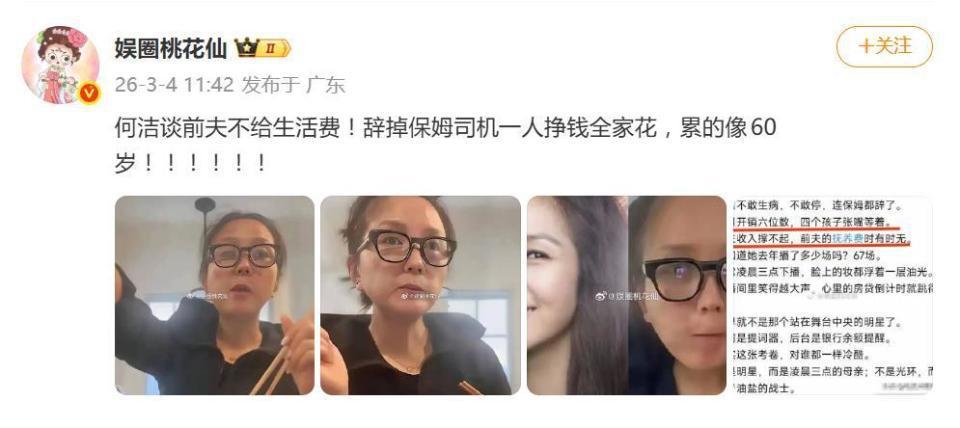 据网友 3 月 4 日爆料,39 岁的歌手何洁在直播中一番 " 每月开销六位数 " 的坦言,瞬间冲上热搜。这波操作不仅晒出了一张令人咋舌的家庭账单,更疑似隔空点名前夫赫子铭抚养费不到位,让一场关于明星消费、单亲妈妈压力与公众眼光的讨论再度炸开了锅。