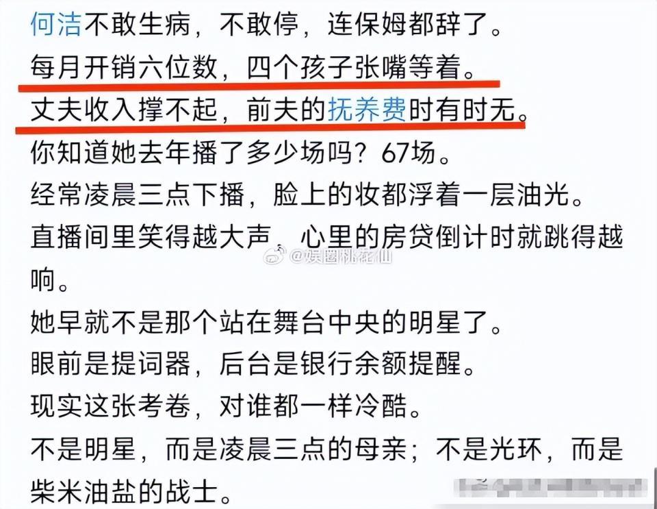 那么,钱从哪来?面对演艺机会减少的现实,何洁的主要收入来源已转向直播带货和商演。数据显示,2025 年她累计直播了 67 场,常常熬到凌晨三点;商演报价则从一度跌至单场 2 万元,逐步回升到百万级别。此外,她还尝试巡演、经营母婴产品等多线业务。高强度连轴转让她的状态尽显憔悴,直播中素颜出镜时明显的黑眼圈和蜡黄面色,成了这场 " 生存战 " 最直观的注脚。