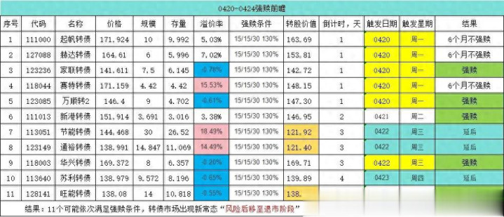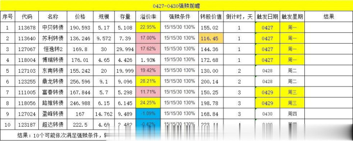 五一节前,仅有4个交易日,将有10个强赎标的。
